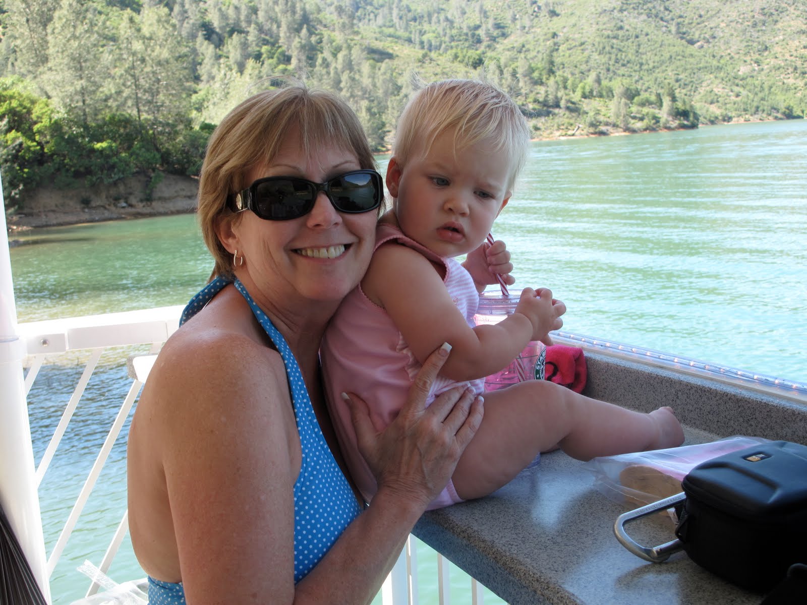 So we left on Sunday at 11:15 am. The plan was to leave a little before Bria's nap so that hopefully she'd fall asleep and sleep for a couple hours. Well, she was kind of cranky but eventually fell asleep around 12:30 pm or so. Then woke up an hour later and would not go back to sleep, so she cried, whined, and fussed most of the way there. This girl does NOT like car rides. But we finally arrived in sunny Shasta and we were thrilled beyond words. We loaded up the houseboat with everyone's stuff (enough stuff for a month) and began our fun family vacation. It was surreal sitting on this ginormous 3-story houseboat with the whole family just looking around at how awesome it was to be together in such a fun place.
